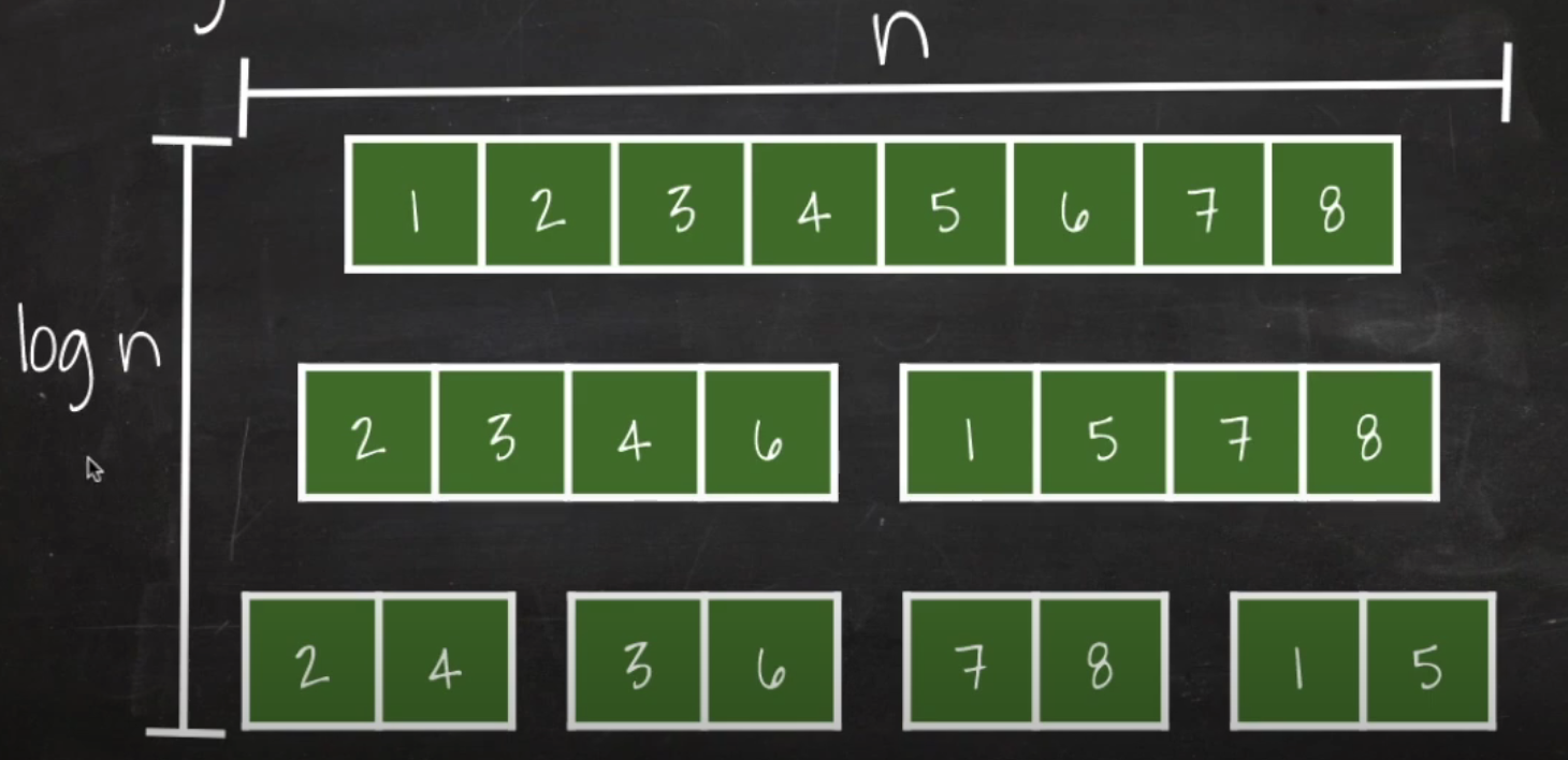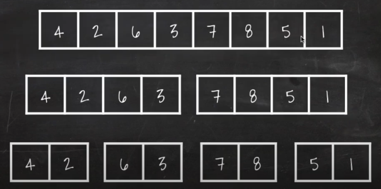 배열을 둘로 나눈다. 나눈 배열을 또 둘로 나눈다. 배열방이 2개씩 남았을때 Merge Sort를 할 수 있다.