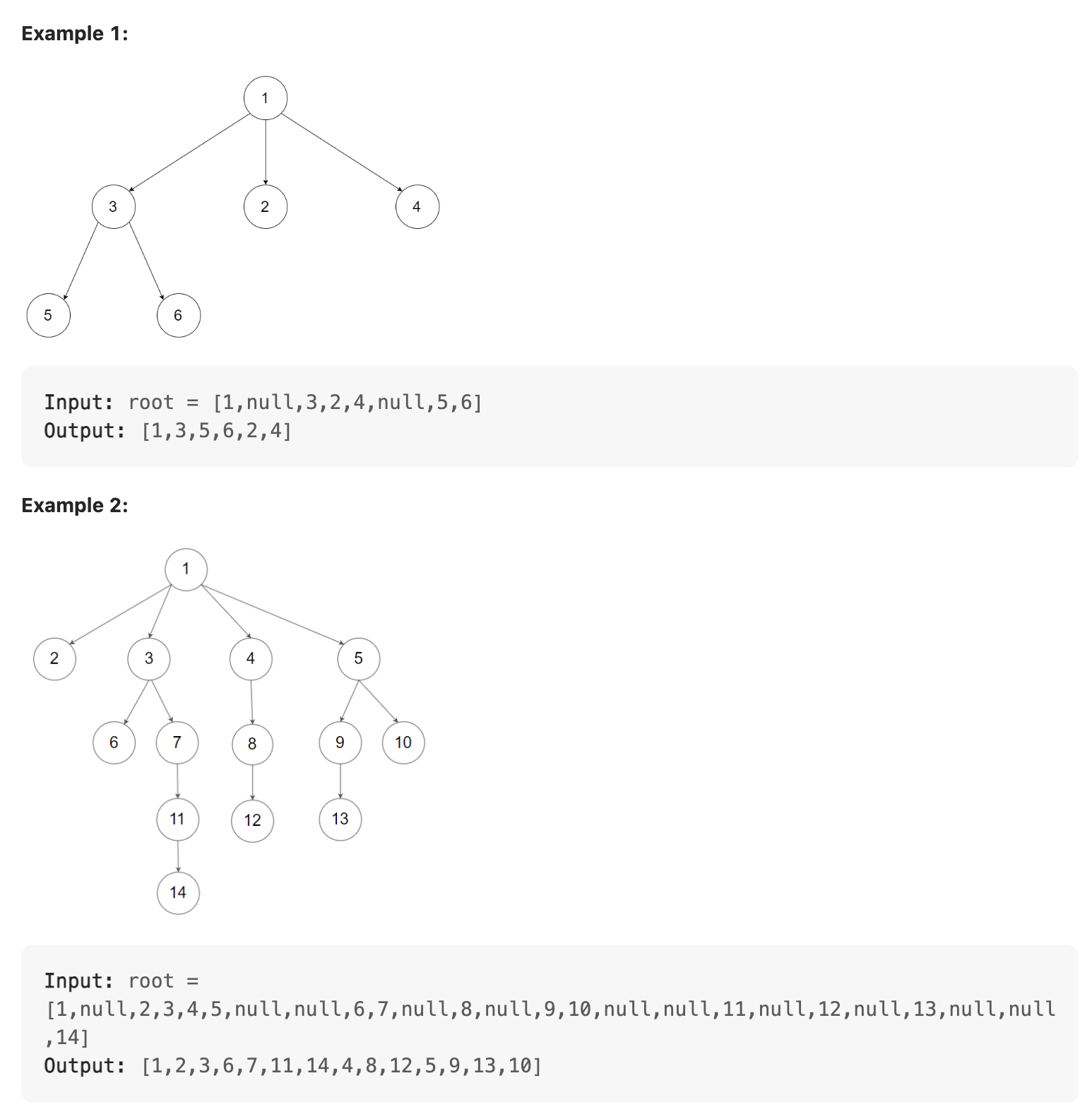 Nary-Tree input serialization is represented in their level order traversal. Each group of children is separated by the null value (See examples)