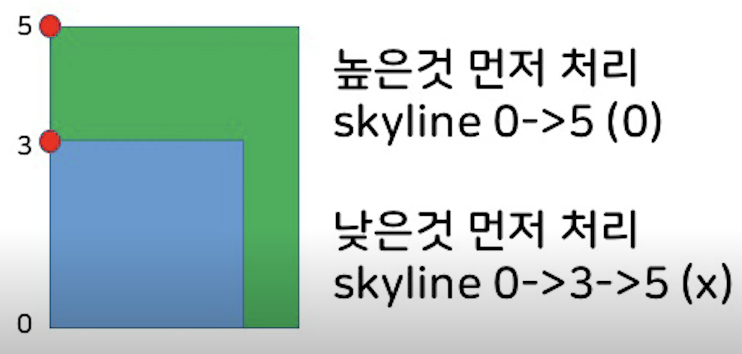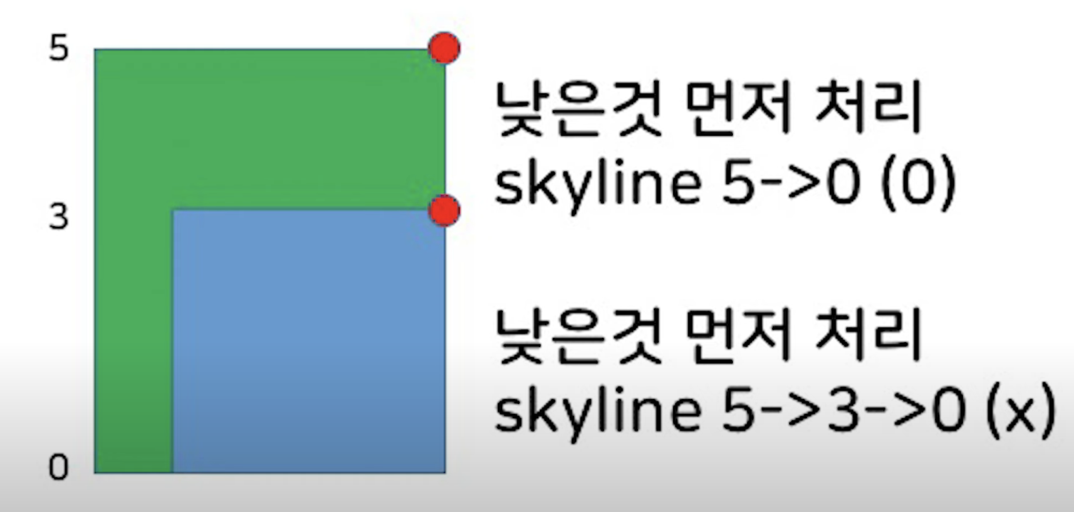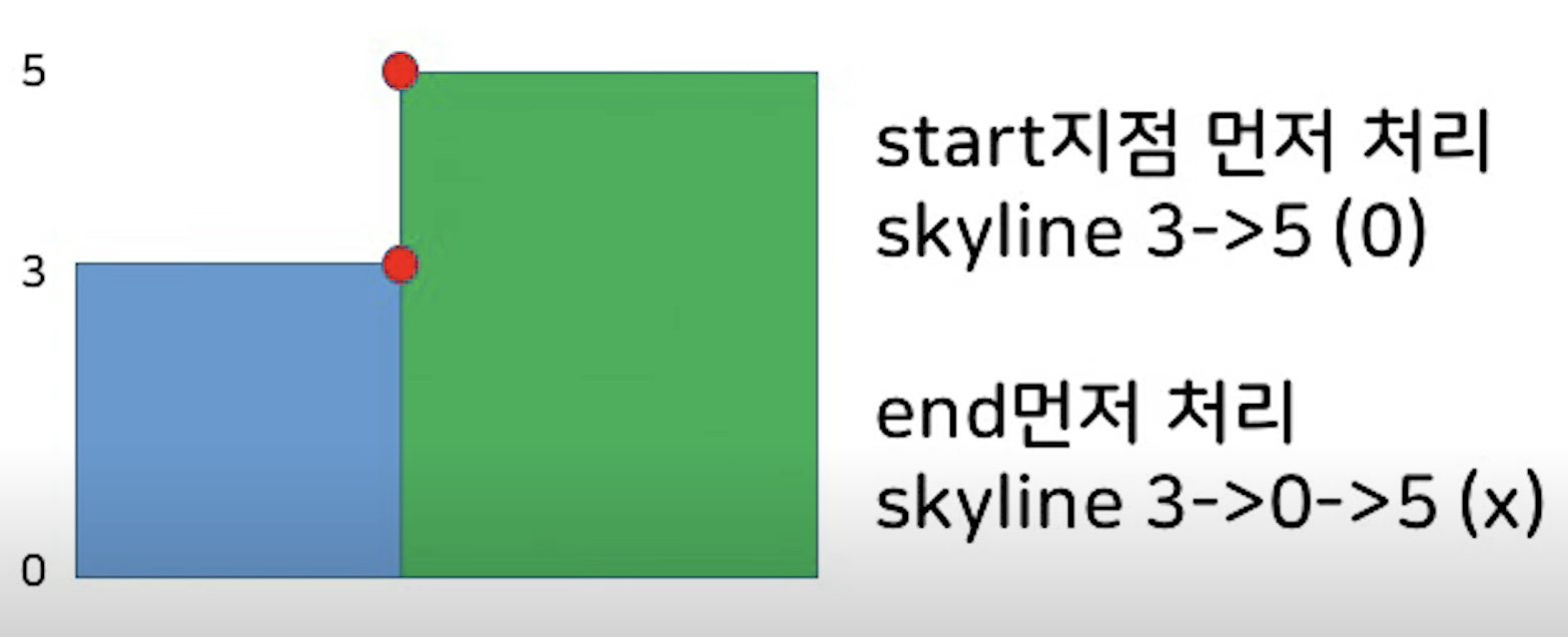 - end(끝나는 것)먼저 처리하게 되면 skyline이 0으로 변한다. 이것은 우리가 원하는게 아니다
