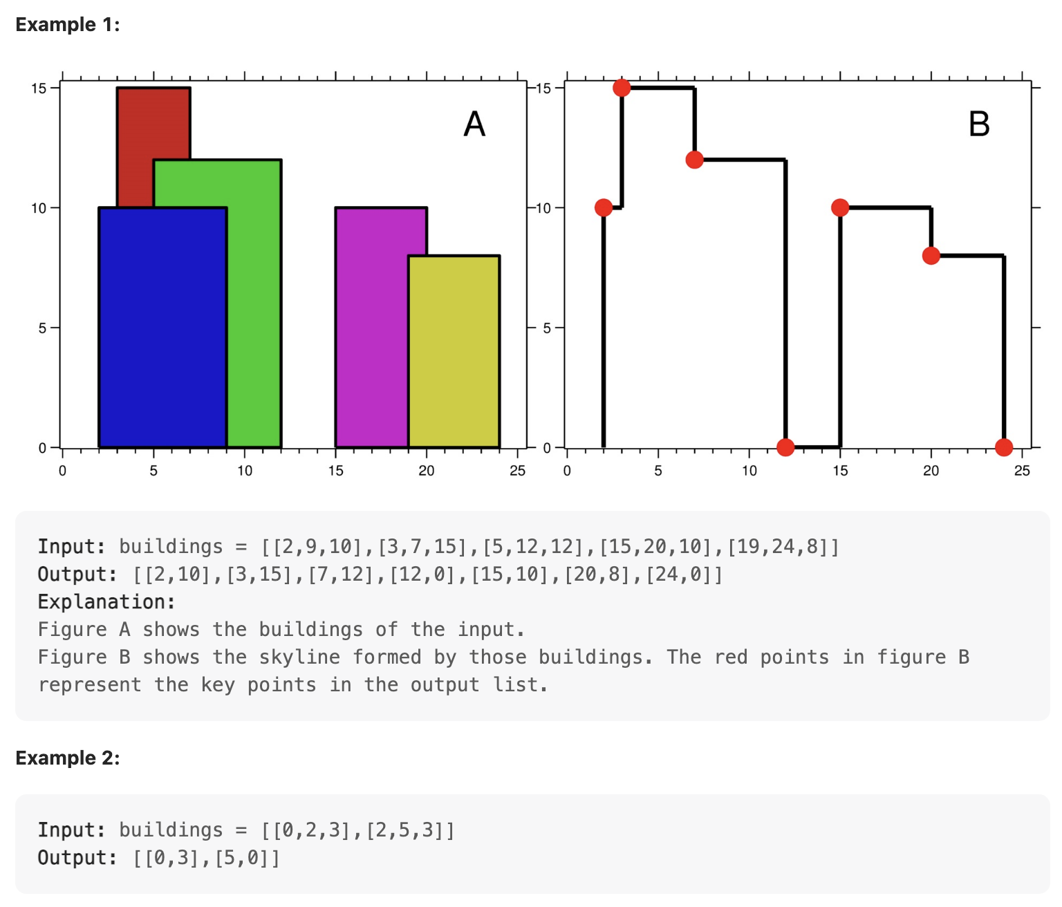 The skyline should be represented as a list of “key points” sorted by their x-coordinate in the form [[x1,y1],[x2,y2],...]. Each key point is the left endpoint of some horizontal segment in the skyline except the last point in the list, which always has a y-coordinate 0 and is used to mark the skyline’s termination where the rightmost building ends. Any ground between the leftmost and rightmost buildings should be part of the skyline’s contour.