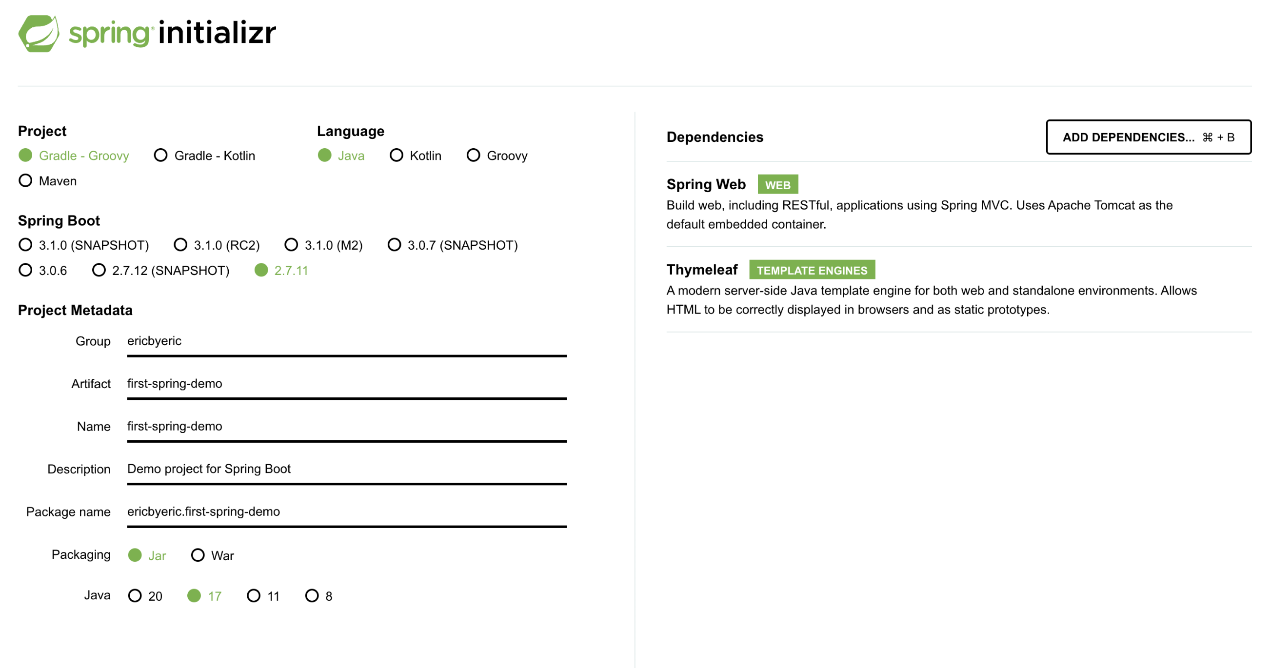 - Spring boot 기반 Spring 프로젝트를 생성해주는 사이트